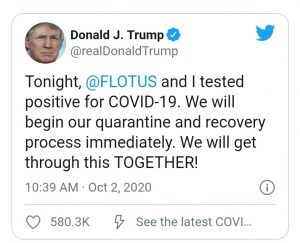 ट्रम्पले ट्विट गर्दै आफूहरूको कोरोना रिपोर्ट पोजेटिभ आएको र क्वारेन्टिनमा बस्न लागेको जानकारी दिएका छन्।