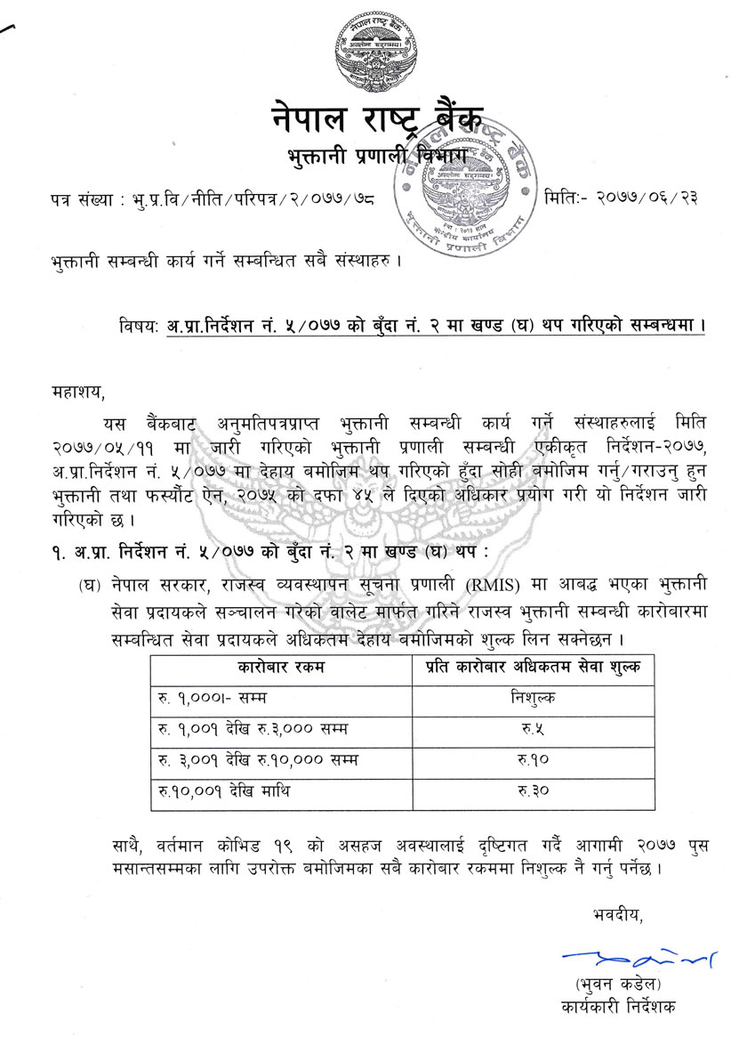 सप्तरी- वालेटको माध्यमबाट गरिने फन्ड ट्रान्सफर तथा भुक्तानी सीमा सम्बन्धी ब्यवस्थामा राजस्व भुक्तानी शुल्क थप भएको छ । सरकारलाई बुझाउने राजस्वको दर अनुसार ५ देखि ३० रुपैयाँसम्म शुल्क लाग्ने नेपाल राष्ट्र बैङ्कले जनाएको छ । यो ब्यवस्था माघ १ गतेबाट मात्र लागू हुनेछ । अहिले भने नेपाल राष्ट्र बैङ्कले कोभिडका कारण सिर्जित परिस्थितिलाई ध्यानमा राख्दै करदाताका लागि पुस मसान्तसम्म वालेटमार्फत गरिने दाखिला निःशुल्क गर्न भनेको छ । नेपाल राष्ट्र बैङ्कले शुक्रबार एक निर्देशन जारी गर्दै शुल्क निर्धारण गरेको हो ।