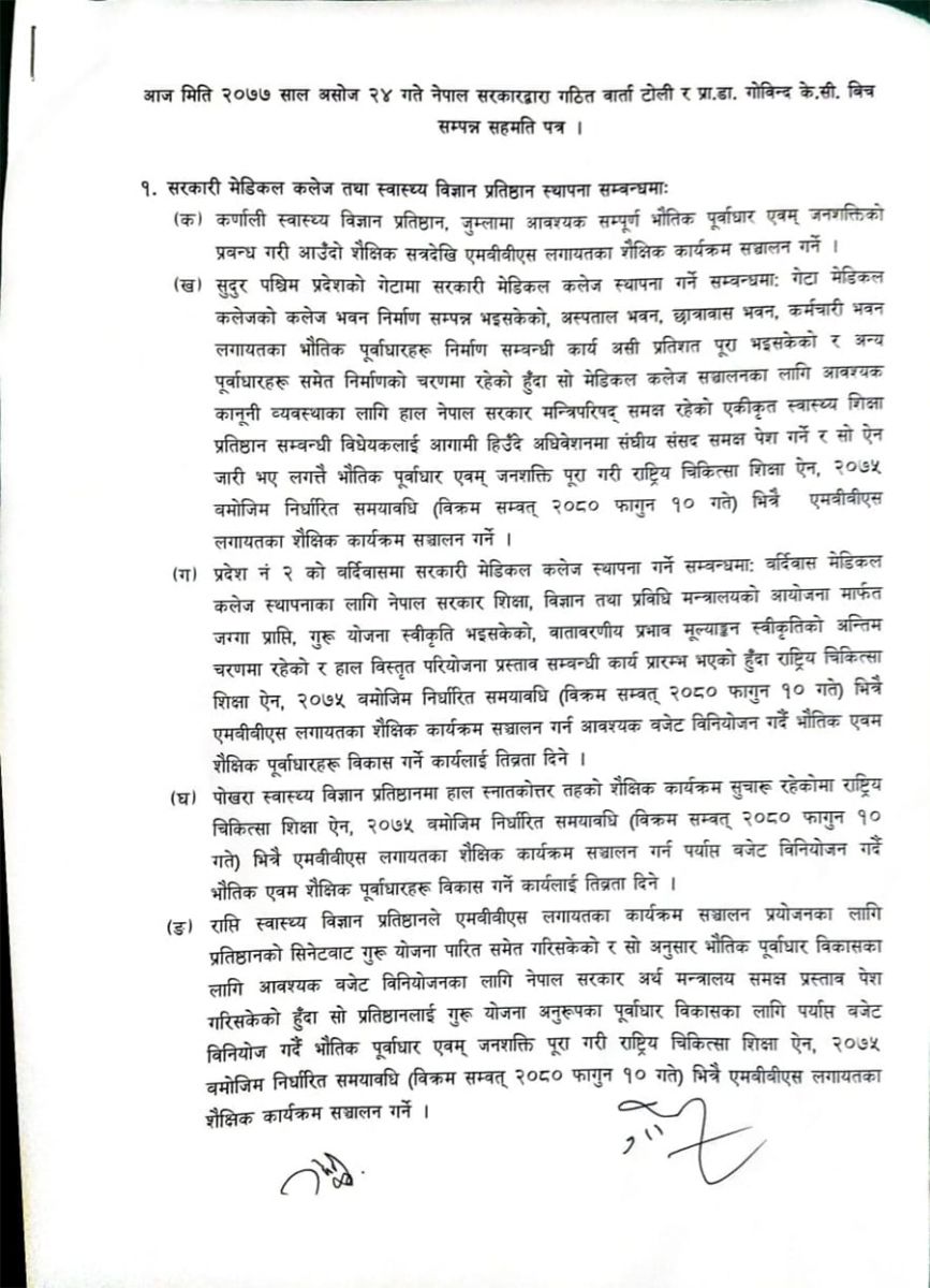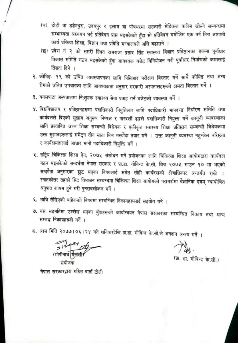 यस्तै चिकित्सा शिक्षा ऐन संशोधनका लागि चिकित्सा शिक्षा आयोगले गठन गरेको कार्यदलको क्षेत्राधिकारमा डा. केसीबीच २०७५ साउन १०लाई पनि राख्ने सहमतिमा उल्लेख छ ।