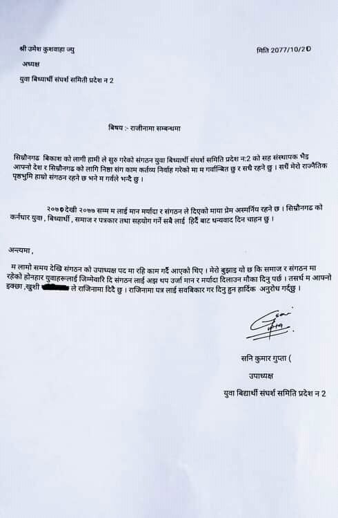 विधार्थी संघर्ष समिति प्रदेश नं. २ को सह–संस्थापनक भई सिम्रौनगढको विकासको लागि निष्ठासंगै काम, कर्तव्य निर्वाह गर्दा गर्वाम्बित महसुस भएको गुप्ताले मंगलबार जारी गरेको बिज्ञप्तीमा उल्लेख छ ।