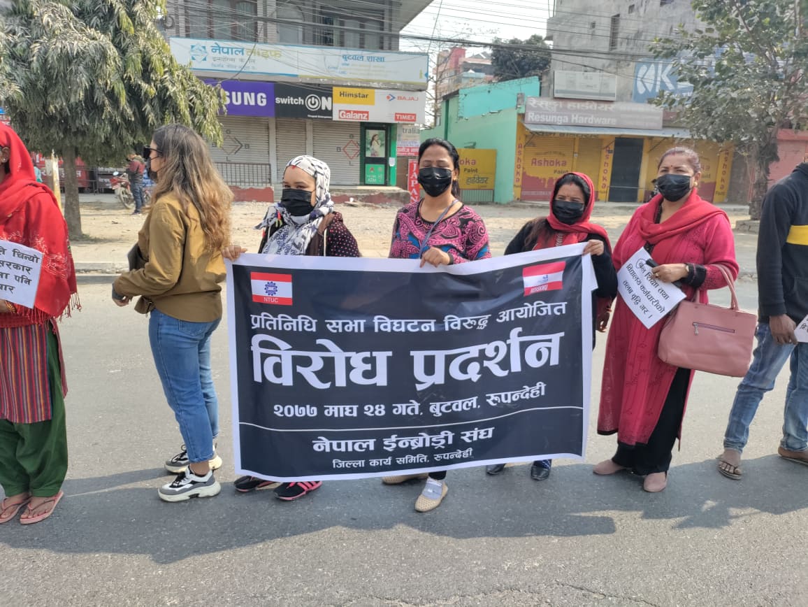 बुटवल : प्रतिनिधि सभा विघटनविरुद्ध नेपाली कांग्रेसका शुभेच्छुक संस्थाहरुले शनिबार देशभर प्रदर्शन गरेका छन्। कांग्रेसले तय गरेको आन्दोलनका कार्यक्रम अन्तर्गत पार्टीका १८ शुभेच्छुक संस्थाले जिल्ला–जिल्लामा सरकारविरुद्ध प्रदर्शन गरेका हुन्। जस अनुसार रुपन्देहीको बुटवलमा प्रदर्शन भएको छ।शुभेच्छुक संस्थाका नेता कार्याकर्ताले राजमार्ग चौराहदेखी मिलनचोक सम्म सडकको एकापट्टीको लेनमा हातमा कालो पट्टि र मुखमा कालो माक्स लगाएर प्ले कार्ड र व्यानर सहित प्रदर्शन गरेका थिए।
