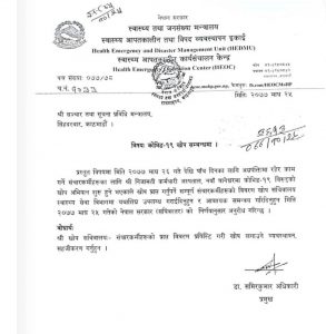 स्वास्थ्य तथा जनसंख्या मन्त्रालयअन्तर्गत स्वास्थ्य आपतकालीन कार्य सञ्चालन केन्द्रले आइतबार एक विज्ञप्ति जारी गर्दै नयाँ बानेश्वरस्थित निजामति कर्मचारी अस्पतालबाट सञ्चारकर्मीलाई खोप लगाउने व्यवस्था मिलाएको जानकारी दिएको हो । आइतबार बसेको सचिवस्तरको निर्णय अनुसार सञ्चारकर्मीलाई खोप लगाउने व्यवस्था मिलाइएको केन्द्रका प्रमुख डा. समीरकुमार अधिकारीले जानकारी दिए ।भोलिदेखि पाँचदिनसम्म सञ्चालन हुने खोप अभियानका लागि स्वास्थ्य सेवा विभागअन्तर्गतको खोप सचिवालयमा सम्पूर्ण सञ्चारकर्मीहरुको विवरण यथाशीघ्र उपलब्ध गराउन समेत केन्द्रले आग्रह गरेको छ ।