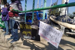काठमाडौं : प्रतिनिधि सभा विघटनको विरोधमा विवेकशील पार्टीले आज पनि माइतीघरमा प्रदर्शन गरेको छ। उक्त पार्टीका नेता कार्यकर्ताले जुत्ता प्रदर्शन गर्दै विधि विधान नकुल्चन सरकारलाई आग्रह गरेको हो।