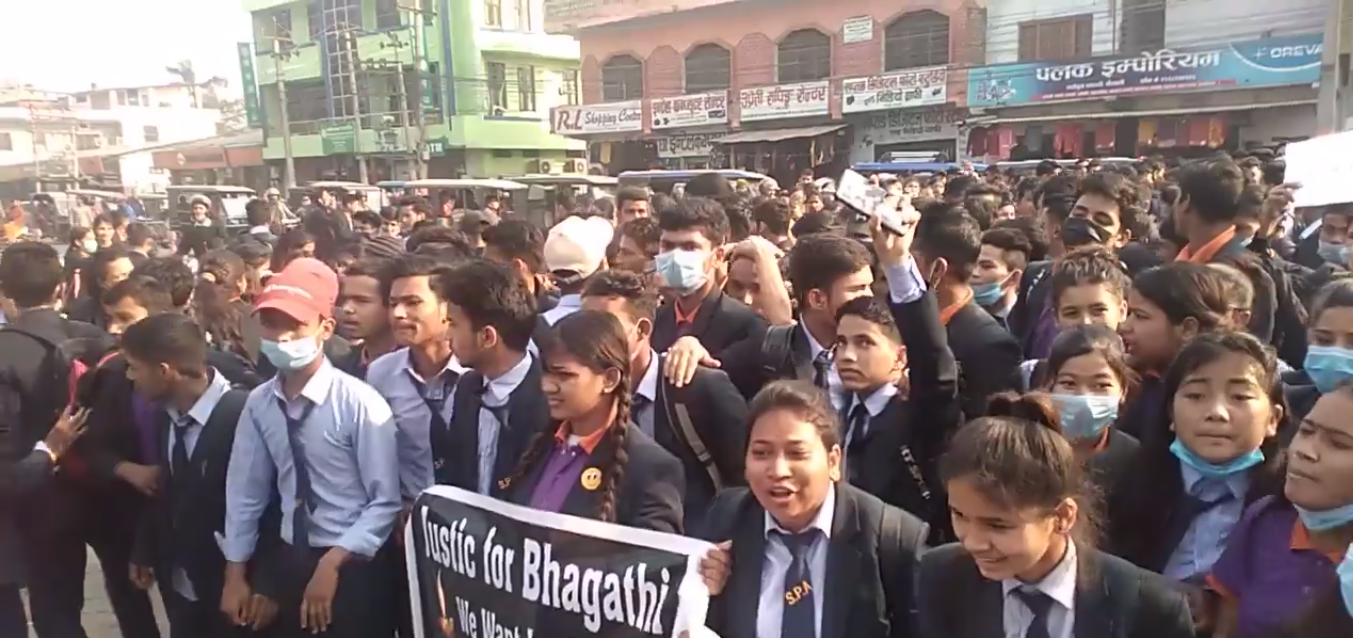 दोषीलाई पक्राउ गरि कारवाहीको माग गर्दै सुदूपश्चिमाञ्चल क्याम्पसका विद्यार्थीहरुले प्रदर्शन गर्दैे मुख्यमन्त्री कार्यालय घेरेका हुन् । विद्यार्थीहरुले बैतडीमा बिहीवार मृत अवस्थामा फेला परेकी किशोरीको हत्या प्रकरणका दोषीलाई यथाशक्य कारवाहीको माग गरेका छन् ।दोगडाकेदार गाउँपालिका–७ की १७ वर्षीया किशोरी भागरथी भट्टको हत्यारालाई यथाशिघ्र कारवाहीको दायरामा ल्याउन मागसहित विद्यार्थीहरुले मुख्यमन्त्री कार्यालयको प्रवेशद्वार अगाडि प्रदर्शन गर्दै हत्यारालाई सार्वजनिक गरी तत्काल कारवाहीको माग गरेका छन्।