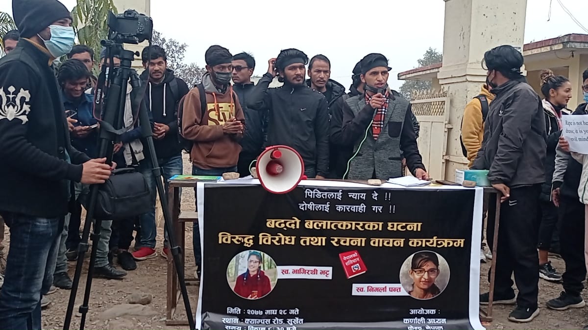 बैतडीमा बलात्कारपछि हत्या गरिएकी १७ वर्षीया किशोरी भागिरथी भट्टको न्यायको लागी, दोषीलाई छिटोभन्दा छिटो कारबाही गरियोस्, निर्मला पन्तको जस्तो हविगत नबनाइयोस भनेर, निधारमा कालोपट्टी, मुखमा कालो मास्क लगाएर बलात्कारिलाई फाँसी दे …!, पीडितलाई न्याय दे.. ! महिला हिंसा तथा यौन दुर्ववहार बन्द गर ! शान्ति सुरक्षा कायम गर, सरकारमाथि को रहेछ बलात्कारी पो रहेछ !, इत्यादि नारा लेखिएका पम्पेलेट समाएर बिरोध गरिएको थियो ।देशका दिदिबहिनी तथा चेलीबेटीहरुले खेपिरहेका महिला हिंसा तथा यौन दुर्ववहार, बढदो क्रममा रहेका बलात्कारका घटना, गैरजिम्मेवारपूर्ण राज्य, राजनीतिक शक्ति र सत्ताले सुरक्षा गरिएका बलात्कारी, अपराधी आदि समाजको यथार्थ विषयबस्तुलाई उठान गरिएका कविता, गजल, मुक्तक, भावना वाचन गरेर बिरोध गरिएको थियो ।कार्यक्रममा एक दर्जन बढी साहित्यक सर्जगहरुले आफ्नो रचना वाचन गरेर न्यायको निम्ति आवज उठाएका थिए । उक्त, कार्यक्रममा रचना वाचनसंगै २० मिनेटको सडक कथा तथा नाटक प्रदशन गरिएको थियो ।जसमा चेलीबेटीले खेपेका पीडा वेदना, आजसम्म घटेका महिला हिँसा, समाजको बलात्कारी प्रवृत्ति र संस्कार, सार्वजनिक क्षेत्र बिद्यालय, बसपार्क, क्याम्पस, आदि कार्यलयमा हेरिने महिला माथीको गिद्दे नजर तथा व्यवहार, सामाजिक सञ्जालमा गरिने दुर्व्यहार बारे कुरा उठाइएको थियो ।