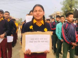 ‘न्याय खोज्न कहाँ जाउँ’ ‘गोर्खा जाउँ कि स्वर्ग जाउँ, जवाफ चाहियो सरकार,’ ‘किन बढ्यो बलात्कार’, ‘महिला हिंसा अन्त्य गर’, बलात्कार कहिलेसम्म, हामी चुप जहिलेसम्म’ बलात्कारीलाई फाँसी दे, संविधानमा टाँसिदेलगायत नारा लेखिएका प्लेकार्डसहित युवा तथा विद्यार्थीहरुले प्रदर्शन गरेका हुन्।