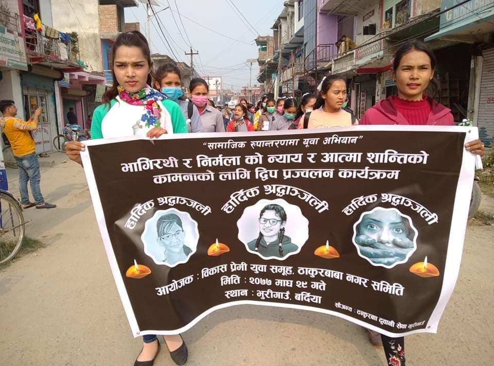 बर्दिया – बलत्कारीलाई फाँसी माग गर्दै बर्दियाका युवारले बिहीबार बर्दियाको भुरिगाउँमा प्रदर्शन गरेका छन्। पछिल्लो समय देशमा बढ्दै गएको हत्या, हिंसा र बलात्कारविरुद्ध विकासप्रेमी युवा समूहले सरकारलाई दबाब दिन र्‍र्याली निकालेको हो।