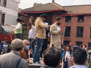 साहित्य सृजक, स्रष्टा तथा मण्डला थियटरका कलाकारहरुले हातमा साङलो बाँधेर प्रर्दशन गरेका हुन् । “सबैखाले प्रतिगमनका विरुद्ध, निरन्तर अग्रगमनको पक्षमा स्रष्टा आन्दोलन”को ब्यानरमा स्रष्टाहरुले भृकुटीमण्डप देखि बसन्तपुर सम्म र्याली निकालेका छन् ।