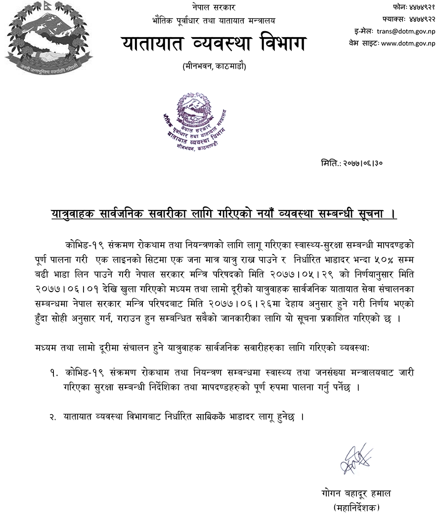 विभागले सबै सिटमा यात्रु बोक्न पाइने नियम भएकाले बढी भाडा नर्तिन यत्राुलाई आग्रह रेको छ । सरकारले यसअघि आधा सिटमा मात्रै यात्रु बोक्दा साविकको भाडाममा ५० प्रतिशतसम्म बढी भाडा लिन पाउने व्यवस्था गरेको थियो । तर, विभागले एक सूचना जारी गर्दै सो नियम खारेज भइसकेको र साविककै दरमा भाडा लिनुपर्ने बताएको छ ।
