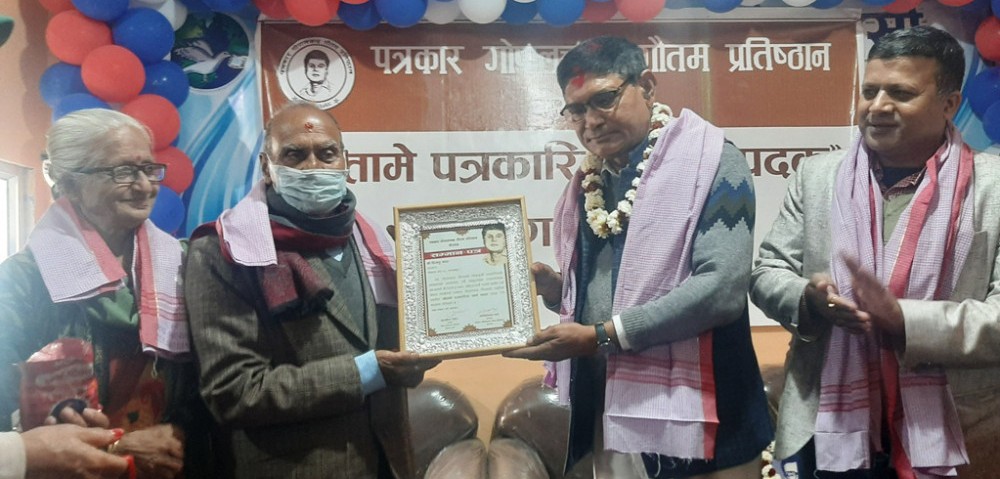 वीरगन्ज — कान्तिपुर दैनिकका सुदूरपश्चिम ब्युरो संयोजक चित्रांग थापा गोतामे पत्रकारिता स्वर्ण पदकबाट सम्मानित भएका छन् । पत्रकार गोपालचन्द्र गौतम प्रतिष्ठान वीरगन्जद्वारा आइतबार आयोजित कार्यक्रममा थापालाई एक तोला सुनबराबरको स्वर्ण पदक प्रदान गरिएको हो ।