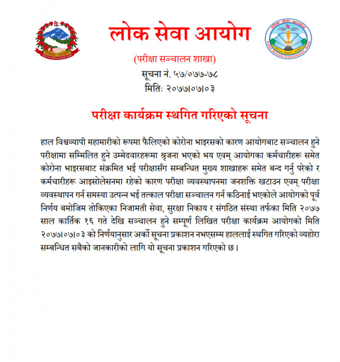 परीक्षार्थीमा देखिएको भय एवं आफ्नै कर्मचारीसमेत संक्रमित हुँदा परीक्षा व्यवस्थापनमा जनशक्ति खटाउन अप्ठ्यारो भएको भन्दै १६ कात्तिकदेखि सुरु हुने भनिएका सम्पूर्ण लिखित परीक्षा अर्को सूचना नभएसम्मका लागि स्थगित गरेको अयोगले जनाएका छन ।