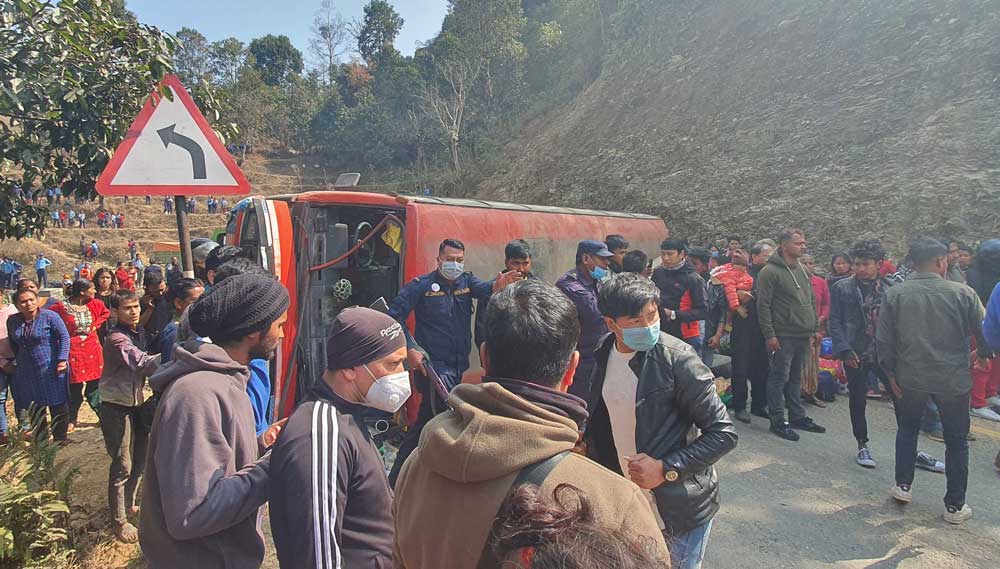 ज्वालामुखी गाउँपालिकाको वडा नं ६ काउलेडाँडाबाट धादिङवेशीतर्फ आउँदै गरेको बा ४ ख ४१५२ नम्बरको बस पाल्पाभन्ज्याङ नजिक सडकमै पल्टिएको थियो।