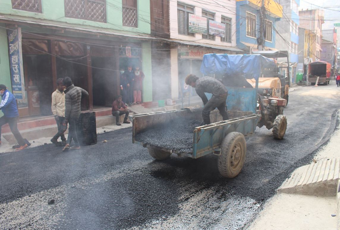 म्याग्दीको सदरमुकाम बेनी बजारको सडक कालोपत्रे गर्दै मजदुर ।बेनी नगरपालिकाले बजारका विभिन्न भागमा सडक कालोपत्रे गरिरहेको छ ।