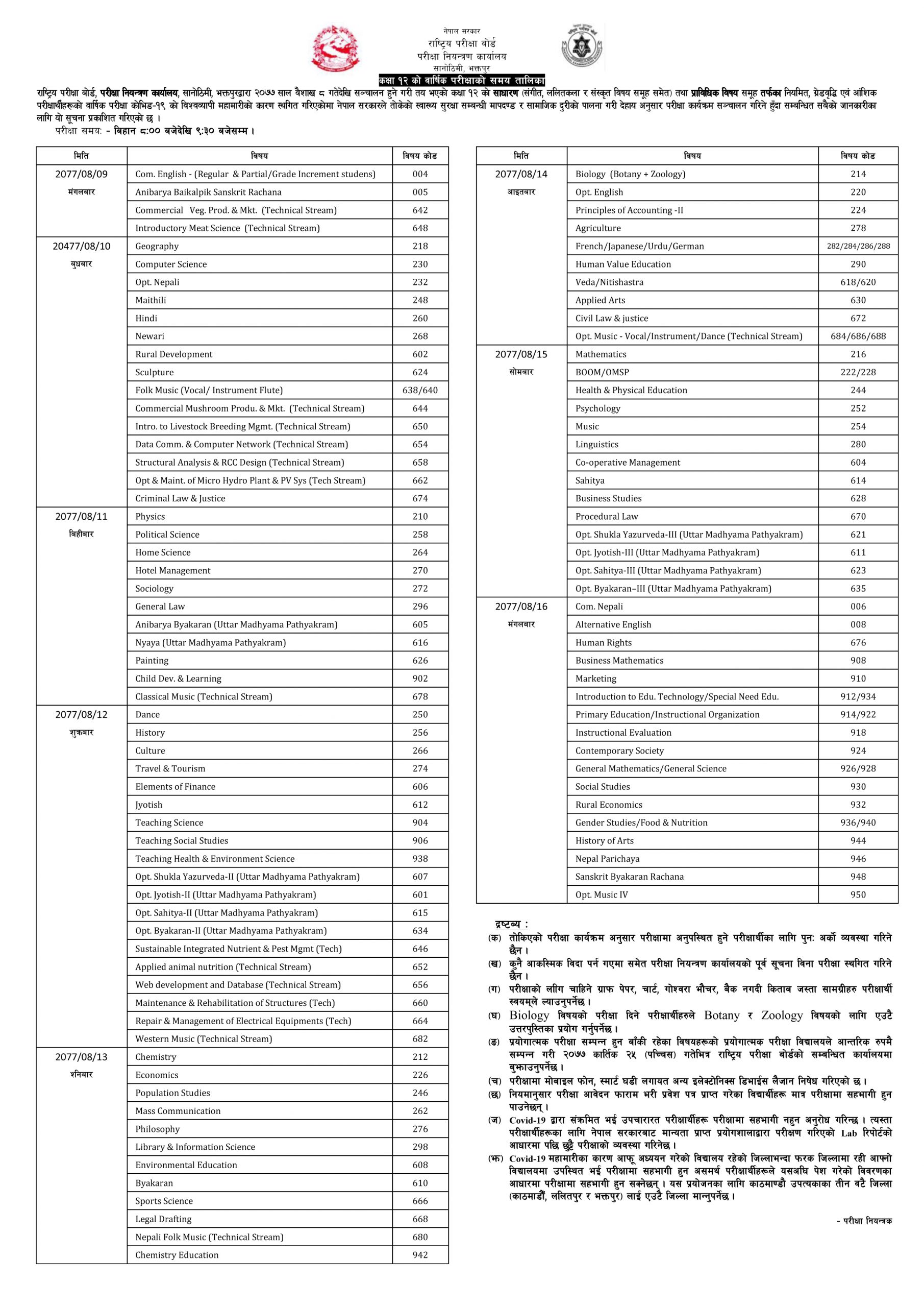 राष्ट्रिय परीक्षा बोर्ड परीक्षा नियन्त्रण कार्यालय, सानोठिमी, भक्तपुरले रुटिन सार्वजनिक गर्दै नियमित र आंशिकतर्फ १२ को परीक्षा गर्न लागेको हो । मंसिर ९ गतेबाट हुने परीक्षा बिहान ८ बजेदेखि ९:३० बजेसम्म हुनेछ ।