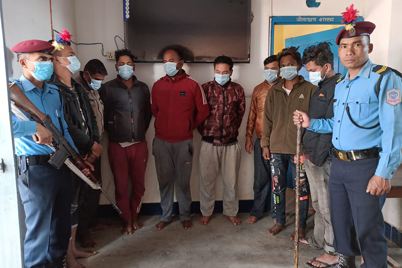 घोराही उपमहानगरपालिका–८ सेवारबाट ६४ हजार ३०० रुपैयाँसहित जुवा खेलिरहेका ८ जनालाई नियन्त्रणमा लिएको जिल्ला प्रहरी कार्यालय दाङले जनाएको छ।जुवा खेलिरहेको भन्ने विशेष सूचनाका आधारमा गएको प्रहरी टोलीले उनीहरुलाई शुक्रबार बिहान साढे १ बजे नियन्त्रणमा लिएको जिल्ला प्रहरी कार्यालय दाङका प्रवक्ता एवं डिएसपी मुकुन्द प्रसाद रिजालले जानकारी दिए।पक्राउ पर्नेमा घोराही उपमहानगरपालिका–८ का २८ वर्षीय तिलक वली, सोही ठाउँका ३५ वर्षीय शरद रावत, ३० वर्षीय समिर खड्का, ३५ वर्षीय सुरेन्द्र चौधरी, २१ वर्षीय यादव राना, ४४ वर्षीय शिवु रावत, ४० वर्षीय रमेश वली र जुवा खेलाउने घरधनी सुरेन्द्र सेनजुवा रहेका उनले जानकारी दिए।