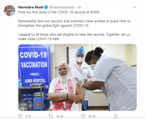सोमवार बिहान नयाँ दिल्लीको एम्स अस्पताल पुगेर खोपको पहिलो डोज लगाएको उनले ट्वीटमार्फत् जानकारी गराएका हुन् ।कोरोना खोप लगाएपछि मोदीले ट्वीटरमा फोटो सेयर गर्दै भारतको बायोटेक निर्मित कोभ्याक्सिनको पहिलो डोज लिएको जनाएका हुन् ।