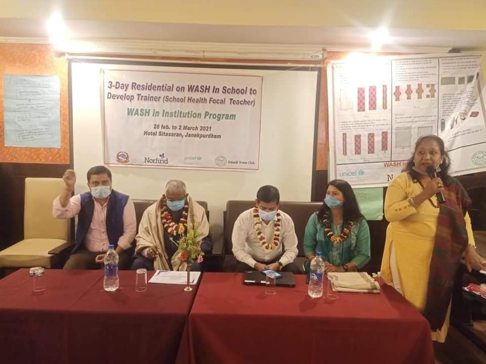 जनकपुरधाममा अाज रतौली युवा क्लव, युनिसेफ र नोरफन्डको संयुक्त अायोजनामा ३ दिने विद्यालय शिक्षक,शिक्षिकाहरुको लागि स्वच्छता सम्वन्धी तालिमको समापन गर्नुहुदै मन्त्री साहले उक्त कुरा वताएका छन।उहाँले विद्यालयहरुमा स्वच्छता लगायत विद्यार्थीको स्वास्थ्यको हेरचाह गर्न मन्त्रालयले ८० जना विद्यालय नर्स परिचालन गरेको वताए।