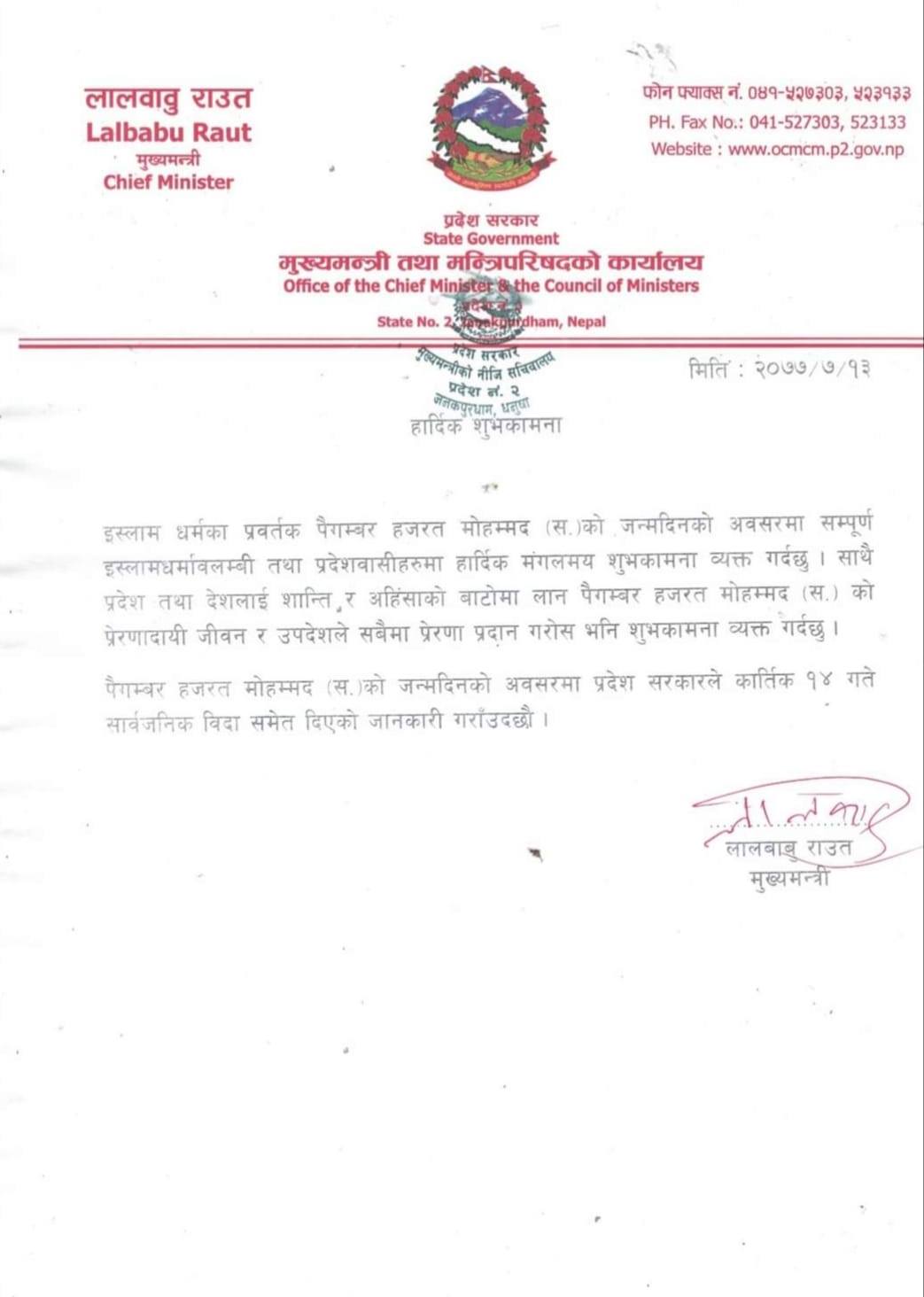 इस्लाम धर्मका प्रदर्तक पैगम्बर हजरत मोहम्मद को जन्मदिनको अवसरमा सम्पूर्ण इस्लाम्धर्मवालाम्बी तथा प्रदेशवासीहरुमा शुभकामना ब्यक्त गर्दै भोलि कार्तिक १४ गत्ते प्रदेश २ का मुख्य मन्त्रि लालबाबु राउत ले सार्वजनिक बिदा घोषणा गरेका छन ।