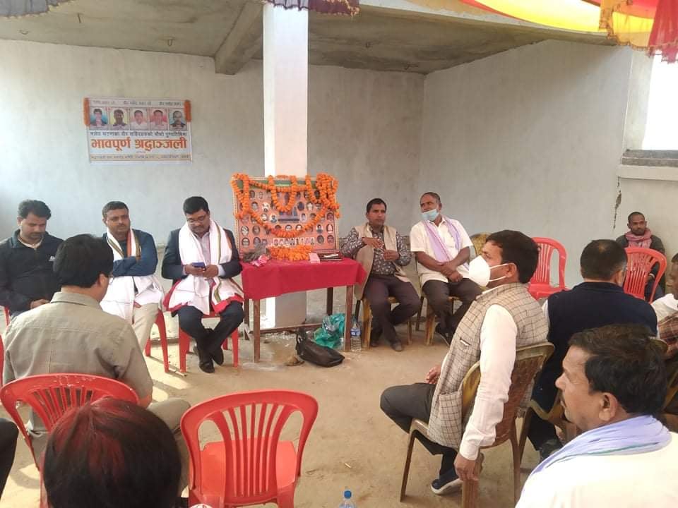 उहाले शहिदहरुकाे सम्मानका साथे एक सहिद परिवार एक राेजगारका साथै सहिद परिवारकाे याेग्यता र क्षमता अनुसार स्थायि राेजगारि दिने प्रदेश सरकारकाे लक्ष्य रहेकाे बताउदै उहाले यसकाे लागि विधेयक छिटे ल्याउन लागिपरेको छ ,प्रदेश सरकार । जसपाका स्थानीय युवा नेता रामचन्द्र यादवकाे अध्यक्ष्ातामा अायाेजित साे सभामा जसपाका केन्द्रीय सदस्यहरु नरेन्द्र यादव , दिनेश कुमार यादव , अशाेक कुमार यादव ,अमरनाथ मण्डल ,महिला नेतृ पुनम यादव ,विघार्थि नेता किशाेर कुमार यादव केसि ,शम्भु यादव ,केदार यादव,हरेराम यादव, राम नारायण यादव रामु .प्रदेश सदस्य भिम तामाङ ,तिलाठि काेइलाडि गाउँपालिकाका अध्यक्ष सतिश कुमार सिह लगायतका बक्ताहरुले वीर शहिदले शहादत पाए पनि मधेशी जनताकाे अधिकार सुनिश्चित नभए सम्म शहिदकाे सपना साकार नहुनेमा जाेड दिनुभयाे ।