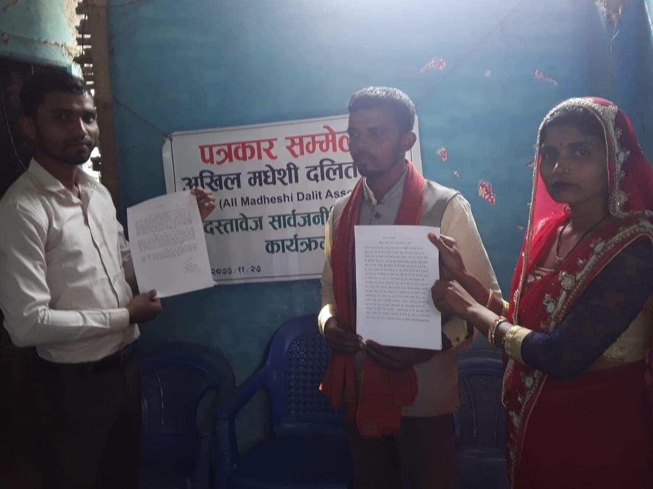 सप्तरीको भारदहमा अाज अायाेजित पत्रकार सम्मेलनमा अखिल मधेशी दलित अभियान सप्तरीका संयोजक देवलाल खंगले दस्तावेज सार्वजनीकिकरण कार्यक्रममा सो कुरा बताउनु भयो । ,“मधेशी दलितहरुको वर्तमान समयमा शोषण,उत्पीडन,दमन तथा राजनैतिक बहिष्करणको सिकार हुदै आएकोले संवैदनशील अवस्थालाई चिरफार गर्न र मधेशी दलितहरुको अधिकार प्रप्तिको निम्ति निरन्तर शान्तिपूर्ण युद्ध मैदानमा सहभागी गराउन अखिल मधेशी दलित जनजागरण अभियानको शुरुवात गर्ने उहाँले बताउनु भयो ”् ।