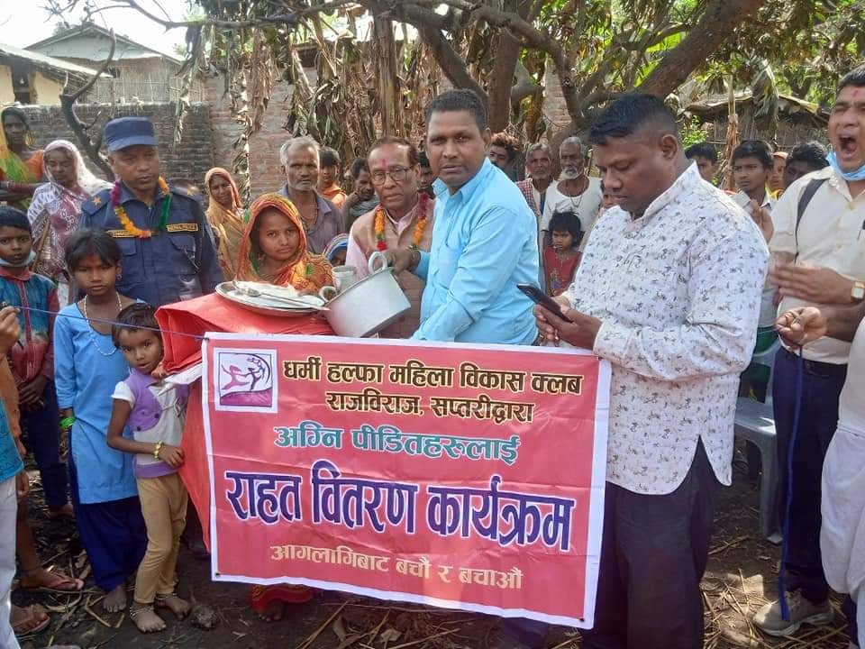 आगलागिबाट सर्वस्य गुमाई बिच्चलीमा रहेका सप्तरीको सुरुंगा नगरपालिका वडा न.-३ भुसिमहौलियाका ४ जना अंग्निपीडित परिवारहरुलाई अाज क्लबले राहत स्वरुप विभिन्न सामग्रीहरु वितरण गरेका हुन । क्लवले राहत स्वरुप त्रिपाल झुल तन्ना धोती साड़ी थाल ग्लास डेकची कराही र छोलनी लगायतका राहत सामग्रीहरु वितरण गरेकाे संस्थाका अध्यक्ष एवम् समाजसेवी ई.सूर्य नारायण यादवले जानकारी दिए। हिजाे आगलागि हुदा अनुमानित १५ लाखभन्दा बढिको क्षति भएको थियाे ।