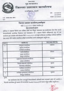 सप्तरी – जिल्ला प्रशासन कार्यालय सप्तरीले कोभिड–१९ को संक्रमण फैलिने जोखिमलाई न्यून गर्न थप सतर्कतासहितका मापदण्ड कार्यान्वयमा ल्याएको हो ।