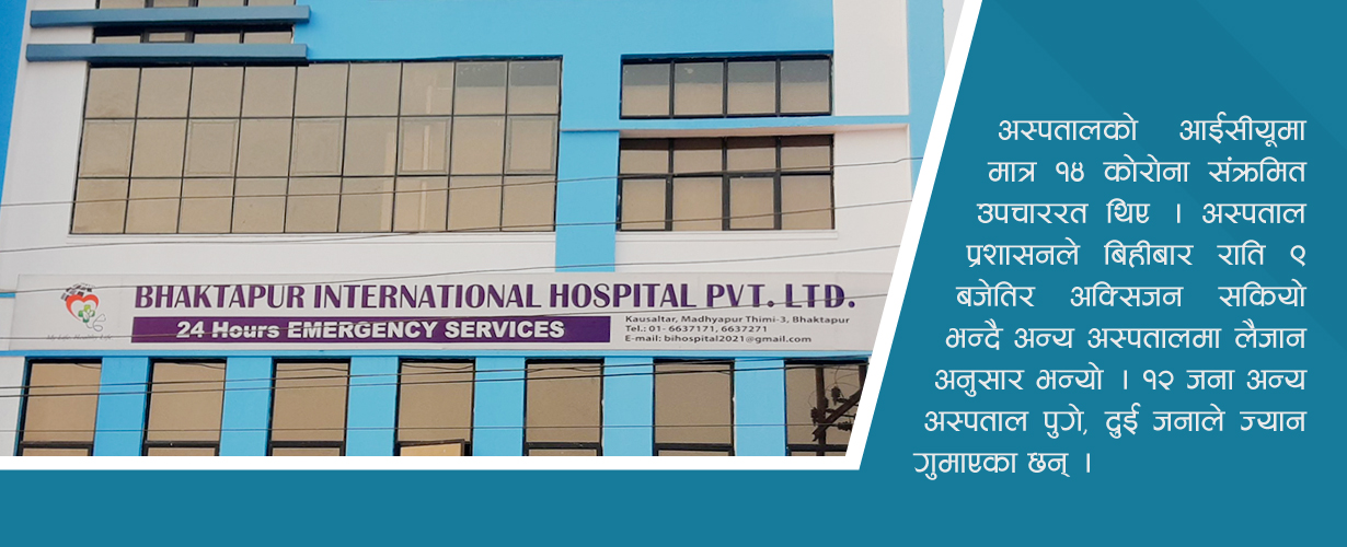 कौशलटारस्थित भक्तपुर इन्टरनेसनल अस्पतालमा १४ जना कोरोनाभाइरस (कोभिड–१९) का संक्रमित आईसीयूमा उपचाररत थिए । बिहीबार राति ९ बजेतिर चिकित्सकले बिरामीका आफन्तलाई बोलाए र आफ्ना बिरामीलाई जतिसक्दो छिटो अर्को अस्पतालमा लैजान आग्रह गरे ।