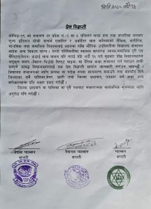 बिद्यालय संचालन गर्न प्रत्यक्ष वा अप्रत्यक्ष रुपमा बतावरण बनाउन तथा सहमति दिने जिल्लाका सबै नगरपालिका / गाउपालिकाका प्रमुख ,प्रहरी तथा जिल्ला प्रशसन कार्यालयलाई समेत अनुरोध गरिएको जारी बिञप्तीमा उल्लेख गरिएको छ ।