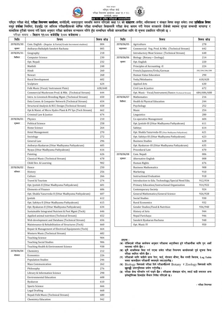 कोभिड-१९ को संक्रमणका कारण यसअघि कक्षा १२ को परीक्षा दुईपटक स्थगित भएको थियो। कक्षा १२ मा तीन लाख ७२ हजार ३४८ परीक्षार्थीका लागि बोर्डले चार हजार ३१० परीक्षा केन्द्र निर्धारण गरेको छ। होम सेन्टरमै स्वास्थ्य मापदण्ड पालना गरेर परीक्षा सञ्चालन गरिने शर्माले बताए। यस वर्ष १०० अंककै परीक्षा हुने भएको छ।
