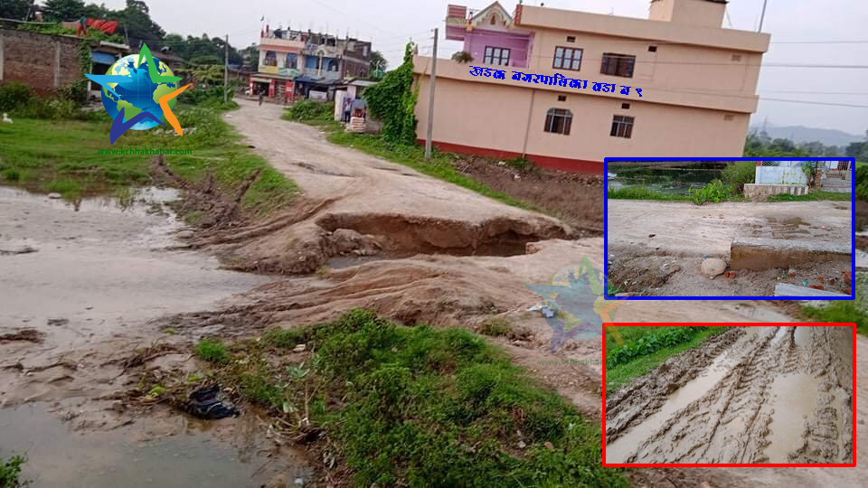 कल्याणपुर बजारदेखि दक्षिण तर्फ करिव २ सय ५० मिटरकाे दुरिमा पानिकाे निकास बन्द भएपछि सडक भतकेकाे हाे ।सडक भतकिएपछि स्थानीयलाई आउजाउमा समस्या उतपन्न भएकाे हो ।