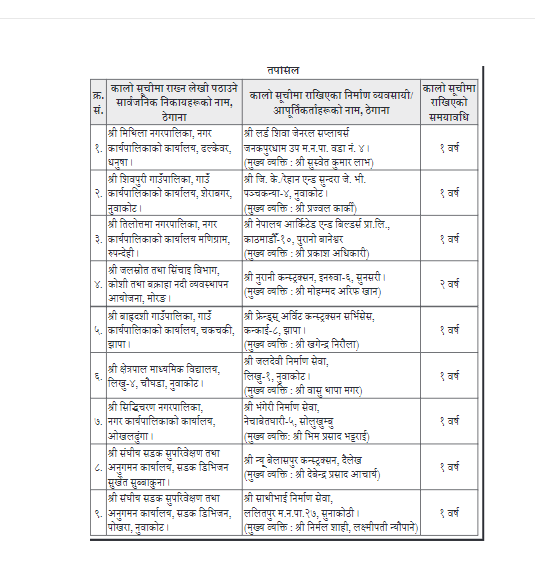 जनकपुरधामस्थित लर्ड शिवा जनरल सप्लायर्स, नुवाकोटको जिकेररेहान एण्ड सुन्दरा जेभी, काठमाडौंको नेपाल आर्किटेड एन्ड बिल्डर्स प्रालि, झापाको फ्रेन्डस अर्विट कन्स्ट्रक्सन, नुवाकोटको जलदेवी निर्माण सेवा, सोलुखुम्बुको भंगेरी निर्माण सेवा, दैलखको न्यू बेलासपुर कन्स्ट्रक्सन र ललितपुरको साथीभाई निर्माण सेवा एक वर्षका लागि कालोसूचीमा परेका हुन् ।