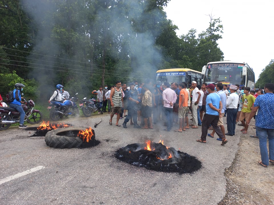 दुर्घटनापछि आक्रोशित स्थानीयले सडकमा टायर बालेर चक्काजाम गरेका हुन्। आज बिहान कृष्णपुर नगरपालिका – ५ मा अत्तरियाबाट महेन्द्रनगर तर्फ जाँदै गरेको म १ च २८८ नम्बरको एम्बुलेन्सले साइकलमा सवार स्थानिय कृष्ण बहादुर ऐरलाई ठक्कर दिएको थियो । एम्बुलेन्सको ठक्करबाट घाईते भएका ऐरको सेती अस्पतालमा लैजाँदै गर्दा बिहान ७ बजे मृत्यु भएको जिल्ला प्रहरी कार्यालय कञ्चपुरले जनाएको छ । ऐर साइकलमा दुध लिएर जाँदै गर्दा एम्बुलेन्सले ठक्कर दिएको थियो ।