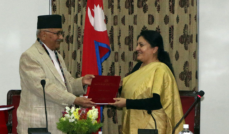 काठमाडौं – राष्ट्रपति विद्यादेवी भण्डारी र नेकपा एमालेका अध्यक्ष केपी शर्मा ओलीबीच भेटवार्ता भएको छ । राष्ट्रपति भण्डारी र एमाले अध्यक्ष ओलीबीच बुधबार राति शितल निवासमा भेटवार्ता भएको हो ।