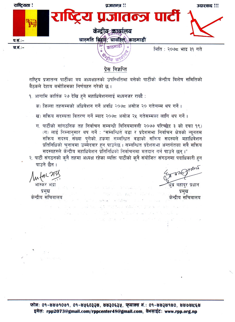 तर पार्टी संगठनको कुनै तहमा अध्यक्ष रहेका व्यक्ति पार्टीको कुनै संयोजित संगठनमा पदाधिकारी हुन नपाउने बैठकले निर्णय गरेको पार्टीका केन्द्रीय सचिवालय प्रमुखद्वय भास्कर भद्रा र ध्रुवबहादुर प्रधानद्वार जारी विज्ञप्तिमा उल्लेख गरिएको छ । राप्रपाले आगामी कार्तिक २७ गते महाधिवेशन गर्ने तय गरेको छ ।