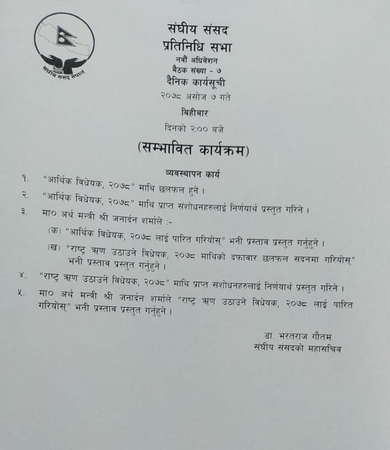 आर्थिक विधेयक २०५८ र राष्ट्र ऋण उठाउने विधेयक २०७८ पारित गर्ने कार्यसूची रहेको छ । यी दुई विधेयक पारित गरियोस् भन्ने प्रस्ताव अर्थमन्त्री जनार्दन शर्माले पेश गर्नेछन् ।