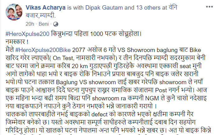भारतीय मोटरसाइकल उत्पादक कम्पनी हिरो मोर्टर्सको हिरो एक्स प्लस मोटरसाइकल किनेको ३ दिनमै चलाउँदै चलाउँदै आफै जलेको ती युवकले दाबी गरेका छन्।