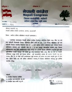 क्षेत्र नम्बर ३ को विवाद नसुल्झाइ विधि र विधानविपरीत जिल्ला अधिवेशनको मिति निर्धारण गर्नु दु:खद् भएको भन्दै पूर्वमहासचिव बजरंग नेपालीले भोक हड्तालको चेतावनीसहित जिल्ला कार्यसमितिलाई ज्ञापनपत्र बुझाएका छन् ।