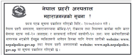 काठमाडौं – नेपाल प्रहरी अस्पताल महाराजगञ्जमा २७ जना स्टाफ नर्स र १० जना सरसफाईकर्मीका लागि जागिरको अवसर खुलेको छ। प्रहरी अस्पतालले कोभिड -१९ को उपचार र कोभिड वार्डमा सरसफाइका लागि उक्त जनशक्ति करार सेवामा नियुक्ति गर्ने भएको हो।