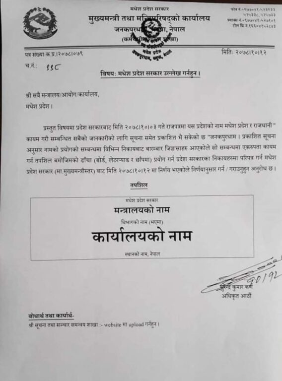 मधेश प्रदेश सरकार मुख्यमन्त्री तथा मन्त्रिपरिषद्को कार्यालय जनकपुरधामले सबै मन्त्रालयल आयोग र कार्यालयहरूलाई सम्बोधन गर्दै माघ ३ गते राजपत्रमा यस प्रदेशको नाम र राजधानी कायम भइसकेकाले एकरुपता कायम गर्न मधेश प्रदेश सरकार र राजधानी जनकपुरधाम प्रयोग गर्न गराउन अनुरोध गरेको हो।