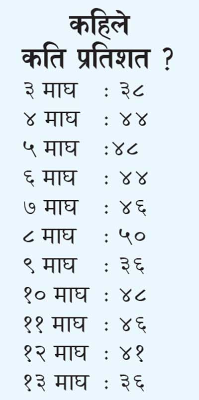 स्वास्थ्य मन्त्रालयको तथ्यांकअनुसार गत ८ माघमा सबैभन्दा धेरै संक्रमणदर थियो । सो दिन ५० प्रतिशत संक्रमण पुष्टि भएको थियो । तर, त्यसयता क्रमशः संक्रमणदर घट्दै गएको देखिन्छ । ८ माघमा १६ जनाको मृत्यु भएको थियो । मृत्यु हुने तीनजनाबाहेक कसैले पनि कोभिडविरुद्धको खोप लगाएका थिएनन् ।