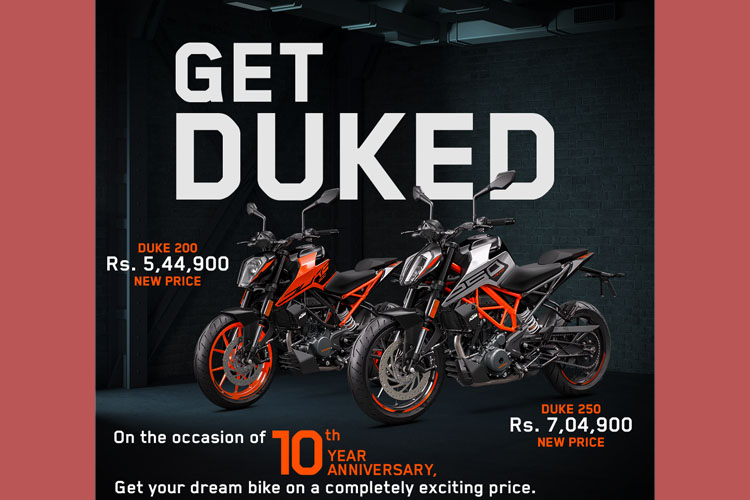 केटीएम २०० ड्युकको नयाँ मूल्य ५ लाख ४४ हजार ९ सय र २५० ड्युकको नयाँ मूल्य ७ लाख ४ हजार ९ सय रुपैयाँ कायम गरिएको छ । यो भन्दा पहिले यी दुई मोटरसाइकलको मूल्य क्रमशः ५ लाख ८४ हजार ९ सय र ७ लाख २४ हजार ९ सय रुपैयाँ थियो ।