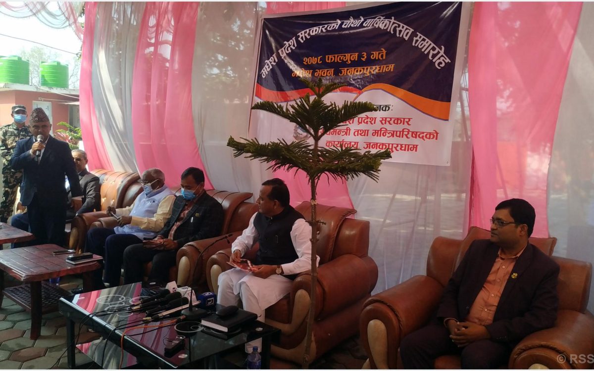 धनुषा – मुख्यमन्त्री तथा मन्त्रिपरिषद्को कार्यालय जनकपुरधाममा मङ्गलबार मधेश प्रदेश सरकारको चौथो वार्षिकोत्सव कार्यक्रममा मुख्यमन्त्री लालबाबु राउत लगायत मन्त्रीहरु । तस्बिरः अजयकुमार साहः रासस