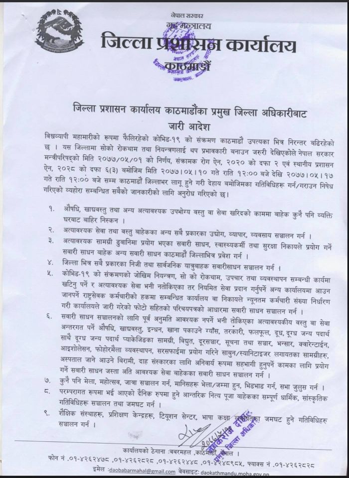 काठमाडौं, भक्तपुर र ललितपुरका तीन प्रमुख जिल्ला अधिकारीले उपत्यकाका सुरक्षा निकायका प्रमुख, नगरपालिकाका मेयर र जनस्वास्थ्य कार्यालयका अधिकारीसँग छलफलपछि निषेधाज्ञा थप गर्ने निर्णय गरेका हुन् ।