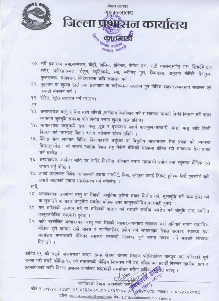 होटल, रेष्टुरेन्ट, फुटपाथ पसलसमेत बन्द हुनेछन् । बैंक लगायतका निकायले न्यूनतम कर्मचारी राखेर स्वास्थ्य सुरक्षाको मापदण्ड पालना गरी सेवा दिन सक्नेछन् ।