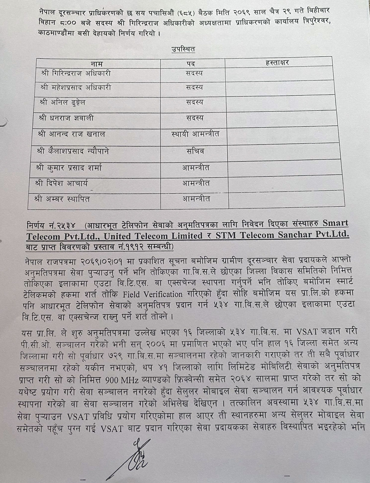 २०६९ सालमा लाइसेन्सबारेको राजपत्र प्रकाशित भएपछि नै युटीएल र स्मार्ट टेलिकमले यसकै आधारमा आधारभूत टेलिफोन सेवाको लाइसेन्स लिएका थिए । आवेदन दिए पनि शर्त पूरा नगरेको ठहर गरेर सीजी टेलिकम (तत्कालीन एसटीएम) लाई लाइसेन्स दिन नसकिने निर्णय प्राधिकरणले गरेको थियो ।
