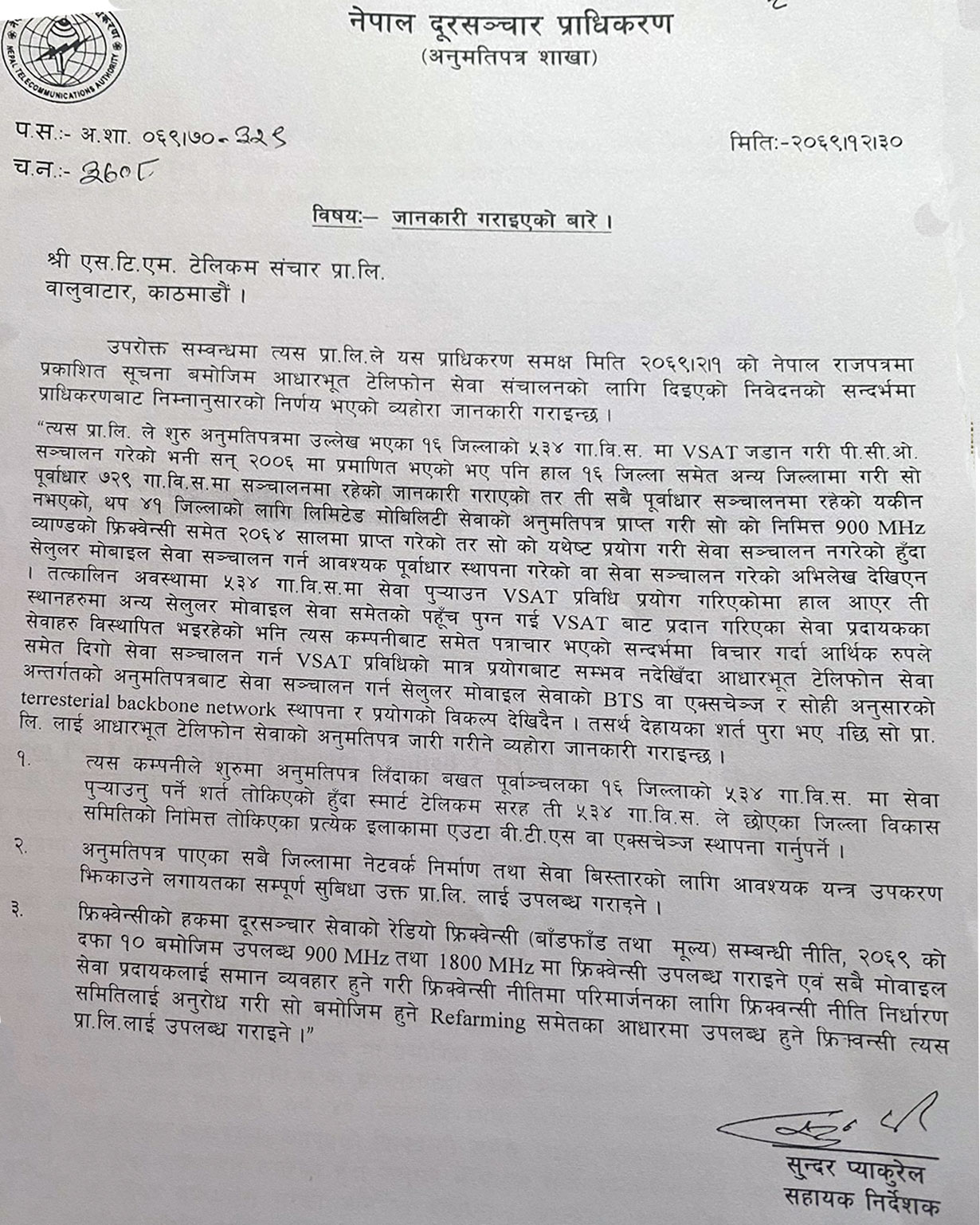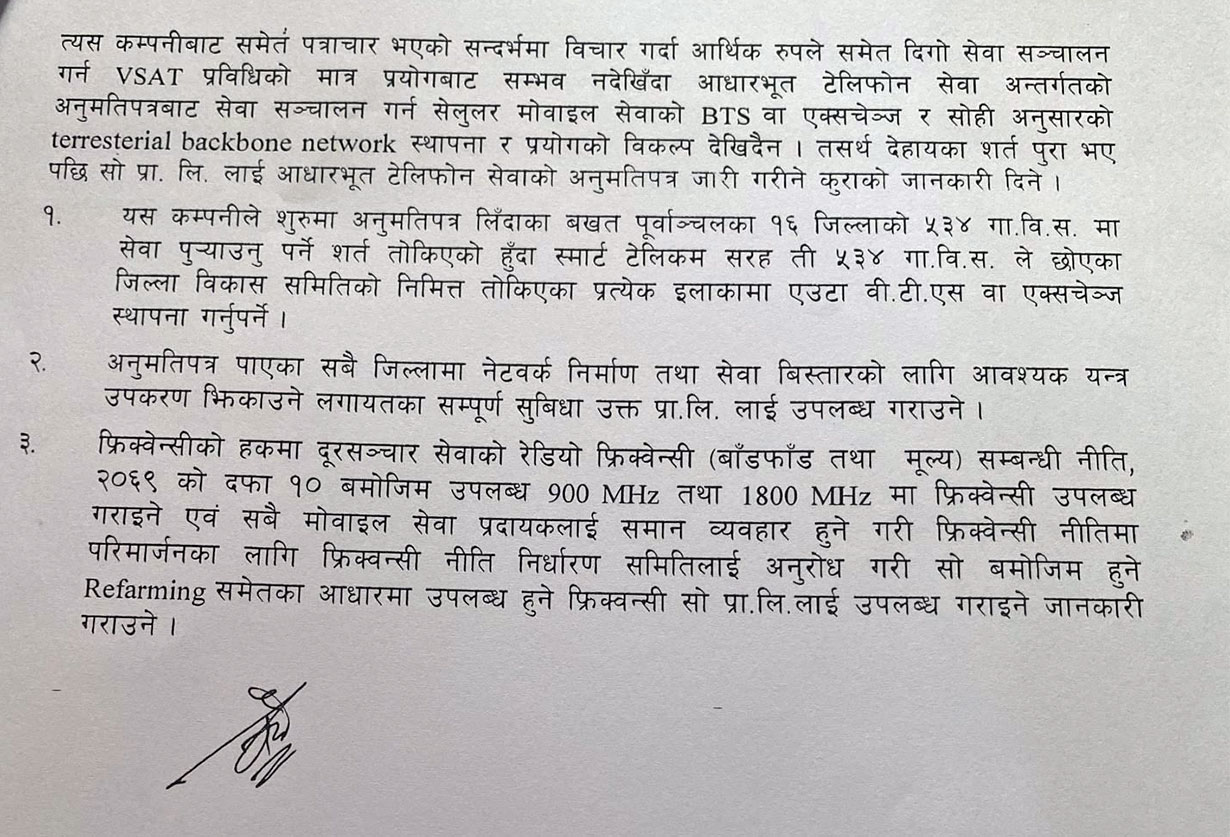 सो राजपत्रमा विभिन्न प्रविधिबाट सेवा दिइरहेका स्मार्ट टेलिकम, नेपाल स्याटलाइट (हेल्लो नेपाल), यूटीएल, एसटीएम टेलिकम सञ्चार (सीजी टेलिकम)लाई तोकिएका शर्त पूरा गरेको अवस्थामा आधारभूत टेलिफोन सेवाको लाइसेन्स दिन सकिने गरी शर्तहरू तोकिएका छन् ।