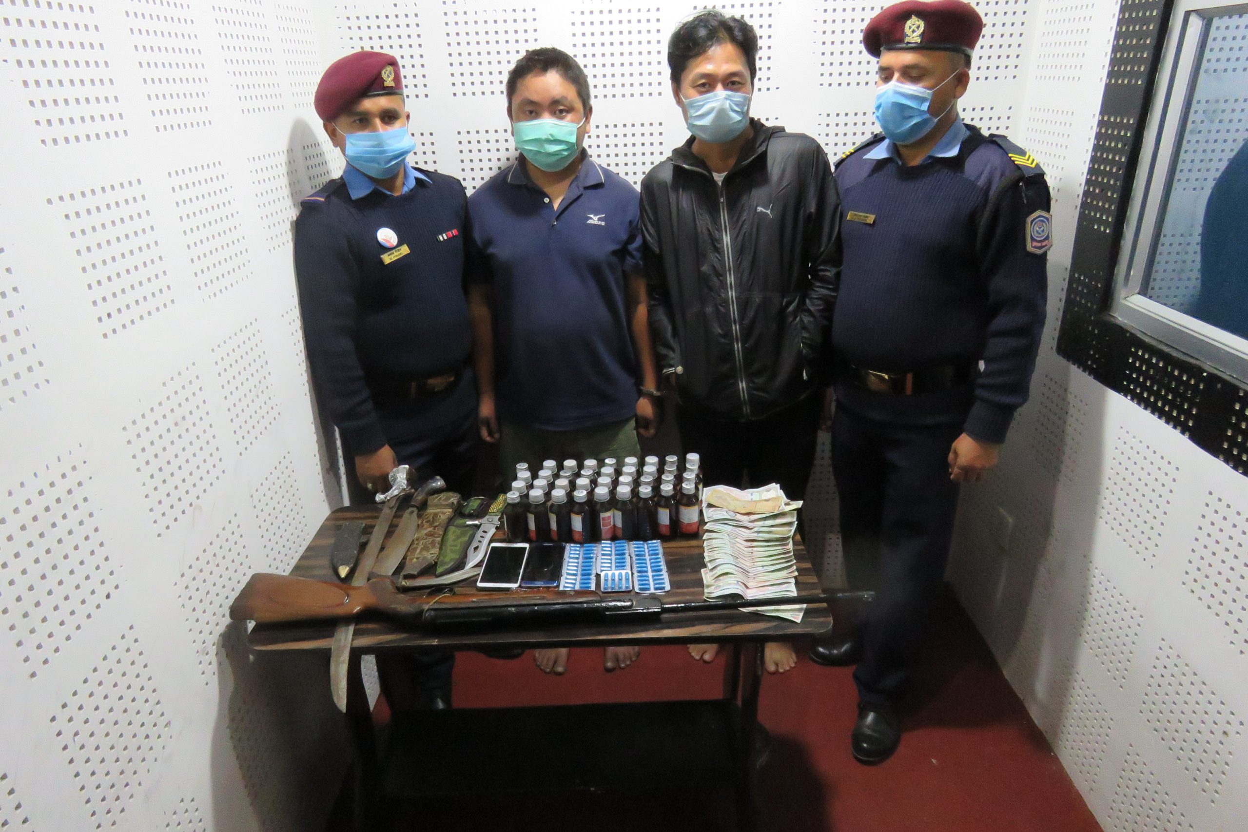 एसपी थापाका अनुसार उनीहरुको साथबाट लागूऔषधसहित हतियार पनि बरामद भएको छ । फलामको तरबार १ वटा, खुकुरी १ वटा, छुरा १ वटा, एयरगन १ वटा, मोबाइल २ थान र २९ हजार पाँच सय रुपैयाँ नगद समेत बरामद भएको थापाले बताए ।