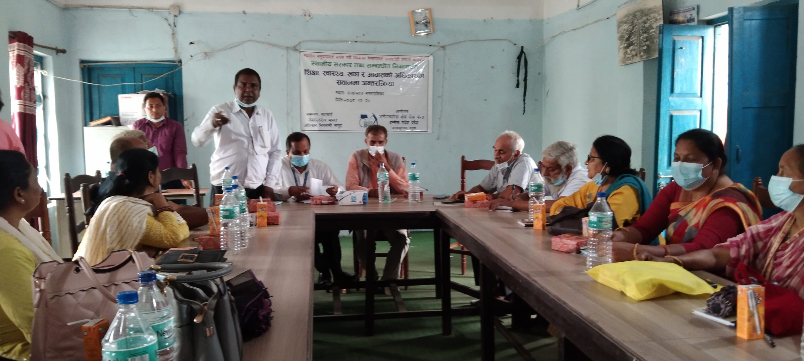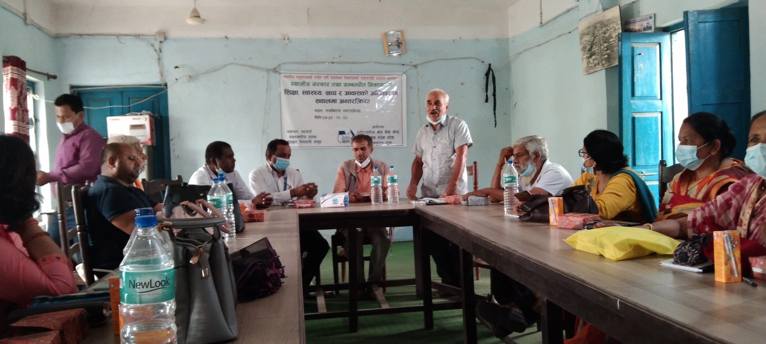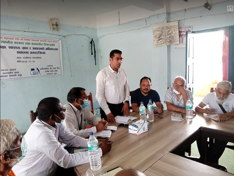 मानव अधिकार संरक्षण र सम्वर्द्धनको लागि राज्यको जबाफदेहिता तथा जनताको सहभागिता अभिवृद्धि कार्यक्रम अन्तर्गत सम्पन्न कार्यक्रममा राजविराज नगरपालिकाका विषयगत शाखाका प्रमुखहरूबाट शिक्षा, स्वास्थ्य, खाद्य र आवासको सवालमा छलफल भएको हो । कार्यक्रममा राजविराज नगरपालिकाका प्रमुख प्रशासकिय अधिकृत भोगेन्द्रप्रसाद यादवले मौलिक हक पूरा नहुँदा नागरिकले न्यायिक प्रश्न उठाउनु स्वभाविक भएको बताउनु भयो । इन्सेकले जनताको सबैभन्दा महत्वपूर्ण अधिकारको विषय उठान गरेको भन्नुहँदै यादवले विषयवस्तुको प्रगति वा कमीबारे दस्तावेजीकरण गर्न र आधारअंक कायम गरी मिलेर लक्ष्य प्राप्त गर्न आग्रह गरे ।