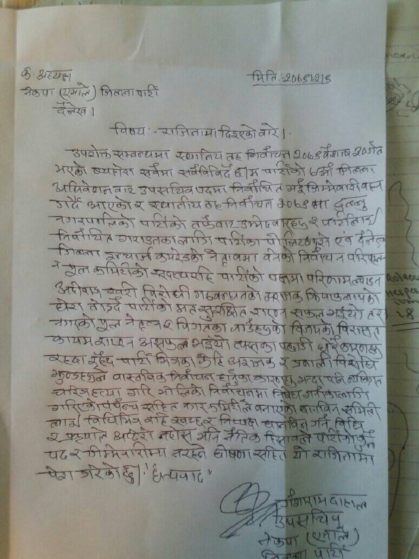 यसरी पालिकाहरु पराजित हुनुमा केन्द्रीय नेताहरुले पार्टीभित्रै अन्तर्घात गरेको स्थानीय कार्यकर्ताहरूको आरोप छ । विशेषगरी एमालेका जिल्ला इञ्चार्ज लक्ष्मी पोखरेलको गृहपालिका दुल्लू नगरपालिकमा एमालेभित्र लफडा बढेको हो । दुल्लुमा एमाले पराजित गर्नुको कारण पार्टी केन्द्रका नेताले अन्तर्घात गरेको भन्दै एमालेको नगर कमिटीले छानविन समिति बनाएको छ । छानविन समिति बनाएपछि एमाले दैलेखका उपसचिव गंगाराम दाहालले पार्टीबाट राजीनामा दिएका छन् । उनले एक विज्ञप्तिमार्फत स्थानीय चुनावमा पार्टी पराजय भएको र त्यसको छानविनका लागि अफ्ठेरो नहोस् भन्दै नैतिक हिसाबले पार्टीबाट राजीनामा दिएको बताएका छन् ।