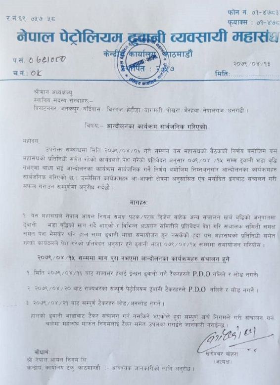यसका साथै, २१ गतेदेखि सम्पूर्ण ट्यांकरबाट लोड/अनलोड नगर्ने उनीहरूले चेतावनी दिएका छन् ।